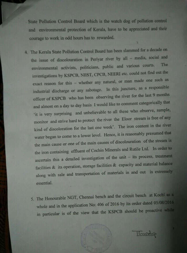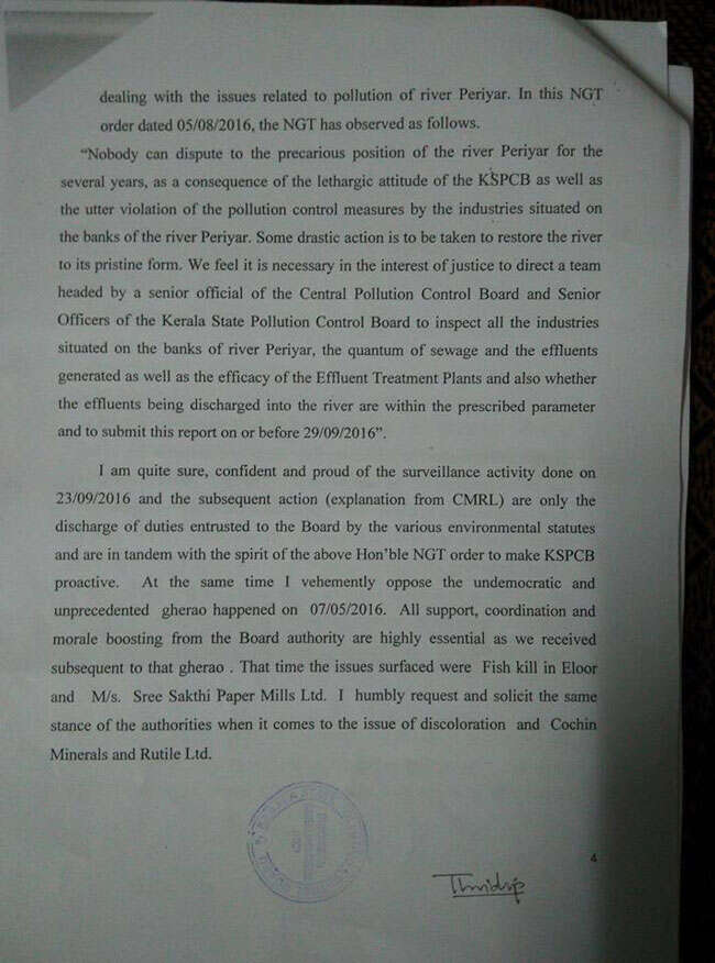 കാരണം കാണിക്കല് നോട്ടീസ് നല്കിയിട്ടില്ലെന്നും കരാര് ജീവനക്കാരന് സെബിന് ജോയ് നിരീക്ഷണം നടത്തുക മാത്രമാണ് ചെയതതെന്നും തൃദീപ് പറഞ്ഞതായി വാര്ത്തയില് പറയുന്നു. പെരിയാറിനോടു ചേര്ന്നു നില്ക്കുന്ന കാടുകള് വെട്ടാത്തതിന് വിശദീകരണം മാത്രമാണ് ചോദിച്ചതെന്നും പാതാളത്ത് സ്ഥിരം ബണ്ടുള്ളതിനാല് വ്യവസായ മേഖലയില് നിന്നുള്ള മാലിന്യം കുടിവെള്ളത്തില് കലരില്ലെന്നും പറഞ്ഞതായാണ് റിപ്പോര്ട്ട്.