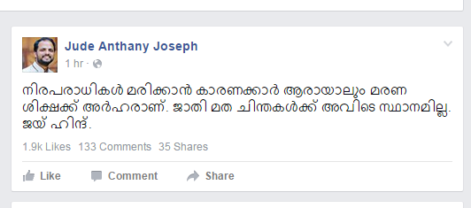 എന്നാല് മേമന്റെ വധശിക്ഷയെ അംഗീകരിച്ചുകൊണ്ട് ഓം ശാന്തി ഓശാനയുടെ സംവിധായകന് ജൂഡ് ആന്റണി രംഗത്തെത്തി. നിരപരാധികള് മരിക്കാന് കാരണക്കാര് ആരായാലും മരണ ശിക്ഷക്ക് അര്ഹരാണ്. ജാതി മത ചിന്തകള്ക്ക് അവിടെ സ്ഥാനമില്ലെന്ന് ജൂഡ് തന്റെ ഫേസ്ബുക്ക് പേജില് കുറിച്ചു. രണ്ടു അഭിപ്രായങ്ങള്ക്കും നിരവധി ലൈക്കുകളും പ്രതികരണങ്ങളുമാണ് ലഭിക്കുന്നത്.