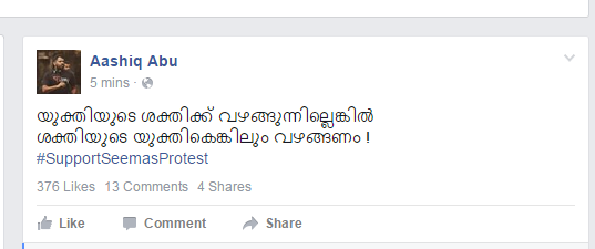 ആലപ്പുഴ: ആലപ്പുഴ സീമാസിലെ ജോലിക്കാര് നടത്തിവരുന്ന സമരത്തിന് സംവിധായകന് ആഷിഖ് അബുവിന്റെ പിന്തുണ. ഫേസ്ബുക്കിലൂടെയാണ് ആഷിഖ് തന്റെ നിലപാട് അറിയിച്ചത്. യുക്തിയുടെ ശക്തിക്ക് വഴങ്ങുന്നില്ലെങ്കില് ശക്തിയുടെ യുക്തിക്കെങ്കിലും വഴങ്ങണമെന്നാണ് ആഷിഖ് ഫേസ്ബുക്കില് കുറിച്ചത്. സമരത്തെ അനുകൂലിച്ച് തോമസ് ഐസക് ഫേസ്ബുക്കില് കുറിച്ച വാക്കുകള് ആഷിഖ് അബു ആവര്ത്തിക്കുകയായിരുന്നു.