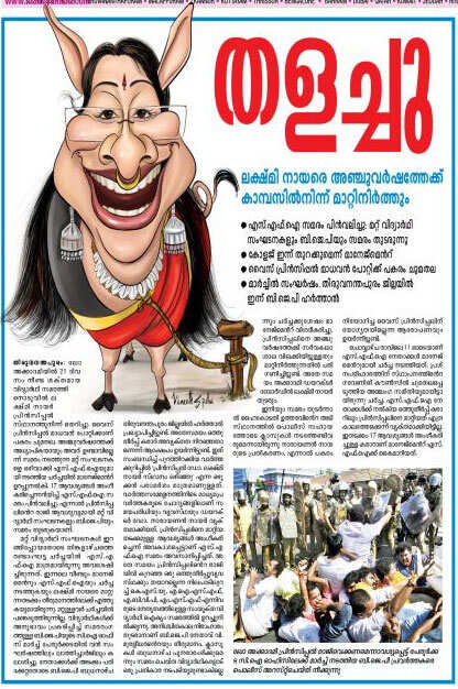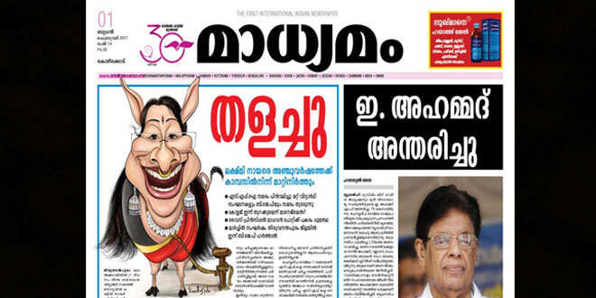 ലോ അക്കാഡമി വിഷയത്തില് വിദ്യാര്ത്ഥി സമരത്തെ തുടര്ന്ന് ലക്ഷ്മി നായര്ക്ക് വിലക്ക് ഏര്പ്പെടുത്തിയ വാര്ത്ത റിപ്പോര്ട്ട് ചെയ്ത മാധ്യമം പത്രത്തിനെതിരെ സോഷ്യല് മീഡിയയില് രൂക്ഷ വിമര്ശനം. സ്ത്രീ വിരുദ്ധത പ്രകടിപ്പിക്കുന്ന കാര്ട്ടൂണോടു കൂടിയാണ് മാധ്യമം വാര്ത്ത് റിപ്പോര്ട്ട് ചെയ്തത്. കന്നുകാലിയെന്നോ കുതിരെയെന്നോ തോന്നും വിധമുള്ള ചിത്രത്തില് തളച്ചു എന്ന തലക്കെട്ടോടെയാണ് മാധ്യം ഈ വാര്ത്ത ആദ്യ പേജില് കൊടുത്തത്. ലക്ഷ്മി നായരോട് വിരുദ്ധ നിലപാടുള്ളവരും ഇതിനെ രൂക്ഷമായി വിമര്ശിച്ചു. ജമാ അത്തെ ഇസ്ലാമിയുടെ മുഖപത്രമായ മാധ്യമത്തിന്റെ സ്ത്രീവിരുദ്ധ നിലപാടിന് മികച്ച ഉദാഹരണമാണ് ഈ ചിത്രവും തലക്കെട്ടുമെന്ന് ചിലര് വാദമുയര്ത്തുന്നു. മഞ്ഞപത്രത്തിന്റെ അത്രക്ക് തരംതാഴരുതെന്ന് ചിലര് പറയുന്നു
