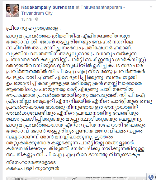 സുരേന്ദ്രന്റെ ഫേ്ബുക്ക് പോസ്റ്റ്