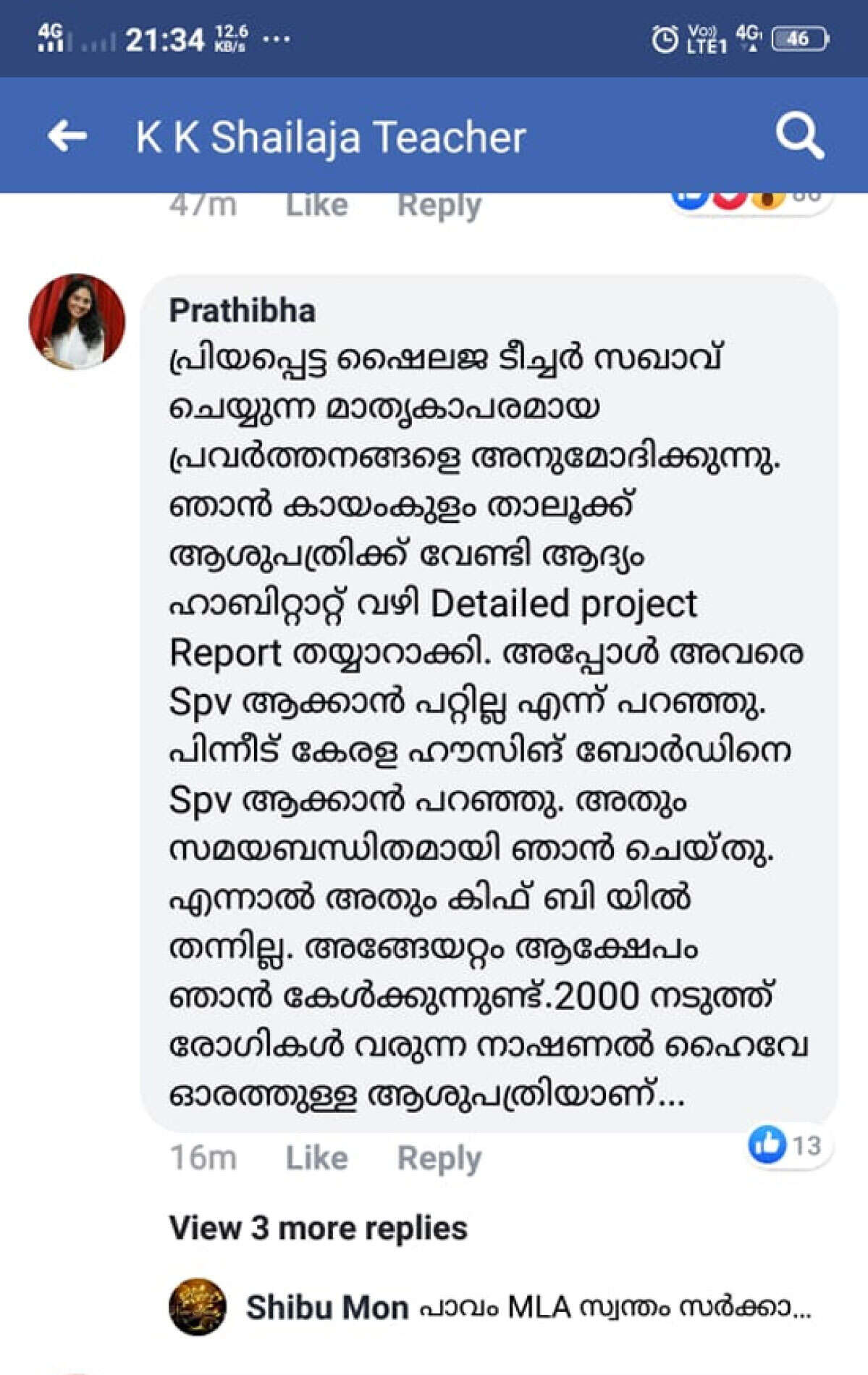 വീണാ ജോര്‍ജിനെ അഭിനന്ദിക്കുന്ന മന്ത്രിയുടെ ഫെയിസ്ബുക്ക് പോസ്റ്റിലാണ് പ്രതിഭ വിമര്‍ശന കമന്റിട്ടത്. തനിക്കും അഭിനന്ദനം കിട്ടാന്‍ അര്‍ഹതയുണ്ടെന്നായിരുന്നു കമന്റില്‍ പറഞ്ഞ്. പ്രിയപ്പെട്ട ഷൈലജ ടീച്ചര്‍, സഖാവ് ചെയ്യുന്ന മാതൃകാപരമായ പ്രവര്‍ത്തനങ്ങളെ അനുമോദിക്കുന്നു. ഞാന്‍ കായംകുളം താലൂക്ക് ആശുപത്രിക്കുവേണ്ടി ആദ്യം ഹാബിറ്റാറ്റ് വഴി Detailed Project Report തയ്യാറാക്കി. അപ്പോള്‍ അവരെ spv ആക്കാന്‍ പറ്റില്ല എന്ന് പറഞ്ഞു. പിന്നീട് കേരള ഹൗസിങ് ബോര്‍ഡിനെ spv ആക്കാന്‍ പറഞ്ഞു. അതും സമയബന്ധിതമായി ഞാന്‍ ചെയ്തു. എന്നാല്‍ അതും കിഫ്ബിയില്‍ തന്നില്ല. അങ്ങേയറ്റം ആക്ഷേപങ്ങള്‍ ഞാന്‍ കേള്‍ക്കുന്നുണ്ട്. 2000 നടുത്ത് രോഗികള്‍ വരുന്ന നാഷണല്‍ ഹൈവേ ഓരത്തുള്ള ആശുപത്രിയാണ്. ഇപ്പോ KEL നെ ടീച്ചര്‍ ചുമതലപ്പെടുത്തിയത് വേഗത്തിലാക്കി കായംകുളത്തിനും പരിഗണന നല്‍കണം. അത്രയധികം ജനം ബുദ്ധിമുട്ടുന്നുണ്ട്. നിരവധി പേര്‍ എന്നെ മെന്‍ഷന്‍ ചെയ്തു. അതുകൊണ്ടാണ് കമന്റ് ഇട്ടത്. ഞങ്ങളെ പോലെയുള്ള എംഎല്‍എമാര്‍ ഒന്നും ചെയ്യാഞ്ഞിട്ടാണ് ആശുപത്രി വികസനം നടക്കാത്തത് എന്ന രീതിയിലെ പ്രചരണം വേദന ഉണ്ടാക്കിയിട്ടുണ്ട്. ഞങ്ങള്‍ക്കും ടീച്ചറില്‍ നിന്ന് അഭിനന്ദനം കിട്ടാന്‍ ആഗ്രഹമുണ്ട്. എന്നായിരുന്നു കമന്റ്