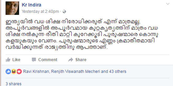 ‘ഇന്ത്യയില് വധശിക്ഷ നിരോധിക്കരുത് എന്ന് മാത്രമല്ല, അപൂര്വങ്ങളില് അപൂര്വമായ കുറ്റകൃത്യത്തിന് മാത്രം വധ ശിക്ഷ നല്കുന്ന രീതി മാറ്റി കുറേക്കൂടി പുരുഷന്മാരെ കൊന്നു കളയുകയും വേണം. പുരുഷന്മാരുടെ എണ്ണം ക്രമാതീതമായി വര്ദ്ധിക്കുന്നത് രാജ്യത്തിനു ആപത്താണ്’ എന്നാണ് പോസ്റ്റ്