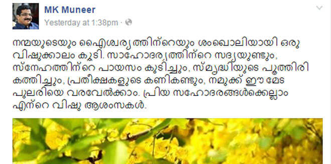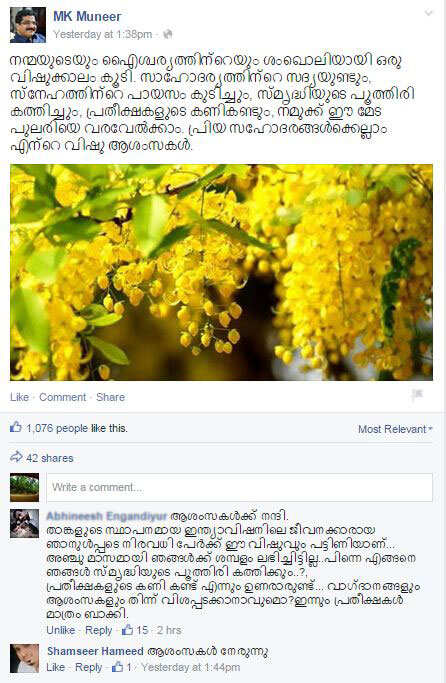 മന്ത്രി മുനീറിന്റെ ഫേസ്ബുക്ക് വിഷു ആശംസയ്ക്ക് ഇന്ത്യാവിഷൻ ജീവനക്കാരന്റെ കമന്റ്