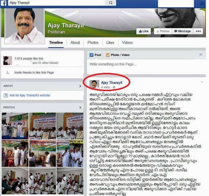 അഴിമതി ആരോപണം നേരിടുന്ന മന്ത്രിമാർ മന്ത്രിസഭയിൽ ഉള്ളിടത്തോളം കാലം ജയം ഒരു മരീചിക ആയിരിക്കും. ബാർ അഴിമതി, സോളാർ കേസ്, തുടങ്ങി എല്ലാവിധ അഴിമതി ആരോപണങ്ങളും ജനങ്ങളിൽ എത്തിക്കഴിഞ്ഞു. മാത്രമല്ല കാർത്തികേയൻ ഒഴിഞ്ഞുപോയ കസേരയിലേക്ക് അനുഭവ സമ്പത്തും പ്രാവീണ്യവുമുള്ള ഒരാളെ കണ്ടെത്തുന്നത് അങ്ങേയറ്റം വിഷമകരവുമാണെന്ന് അജയ് തറയിൽ തന്റെ ഡിലീറ്റ് ചെയ്ത സ്റ്റാറ്റസിൽ പറയുന്നു.