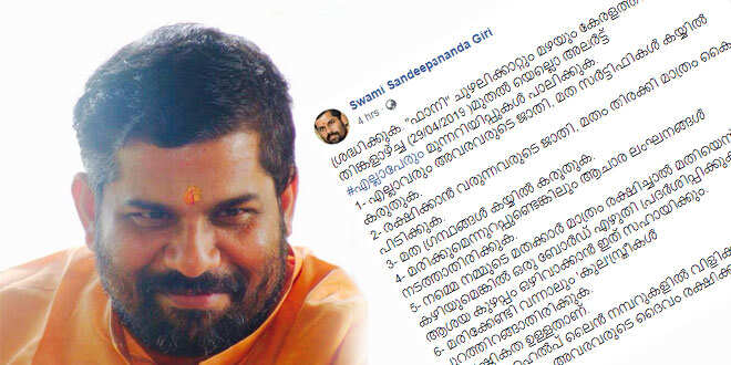 മരിക്കേണ്ടി വന്നാലും ‘കുല’സ്ത്രീകള് പുറത്തിറങ്ങാതിരിക്കുക; ഫാനിയില് മുന്നറിയിപ്പ് നല്കി സന്ദീപാനന്ദ ഗിരി
