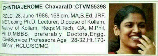 ചിന്താ ജെറോമിന്റെ മാട്രിമോണിയല് പരസ്യമെന്ന പേരില് ഫേസ്ബുക്കില് പ്രചരിക്കുന്ന ചിത്രം വൈറല്