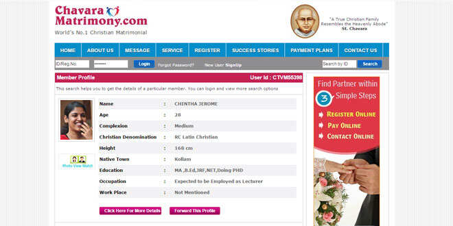 ഡിവൈഎഫ്ഐ നേതാവ് ചിന്താ ജെറോമിന്റെ മാട്രിമോണിയല് പരസ്യമെന്ന പേരില് പ്രചരിക്കുന്ന ചിത്രം വൈറലാകുന്നു. ക്രിസ്ത്യന് വിവാഹങ്ങള്ക്കായുള്ള മാട്രിമോണിയല് വെബ്സൈറ്റായ ചാവറ മാട്രിമോണിയില് ചിന്താ ജെറോമിന്റെ പേരില് നല്കിയിരിക്കുന്ന പ്രൊഫൈലിന്റെ സ്ക്രീന്ഷോട്ടാണ് സോഷ്യല്മീഡിയയില് പ്രചരിക്കുന്നത്. ആര്സി ലാറ്റിന് ക്രിസ്റ്റ്യന് എന്ന മതം വിശദീകരിച്ചിരിക്കുന്നതാണ് ഏറ്റവും കൂടുതല് വിമര്ശിക്കപ്പെടുന്നത്.