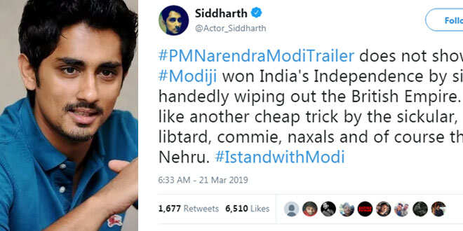 പ്രധാനമന്ത്രി നരേന്ദ്ര മോഡിയുടെ ജീവചരിത്രമെന്ന പേരില്‍ അണിയറയില്‍ ഒരുങ്ങുന്ന ‘പിഎം നരേന്ദ്രമോദി’ എന്ന സിനിമയെ ട്രോളി നടന്‍ സിദ്ധാര്‍ത്ഥ്. ചിത്രത്തിന്റെ ട്രെയിലര്‍ കഴിഞ്ഞ ദിവസം പുറത്തിറങ്ങിയിരുന്നു. ബ്രിട്ടീഷ് സാമ്രാജ്യത്തെ ഒറ്റക്ക് നിഷ്‌കാസനം ചെയ്ത് മോഡിജി ഇന്ത്യക്ക് സ്വാതന്ത്ര്യം നേടിത്തന്നത് ചിത്രത്തില്‍ കാണിക്കുന്നില്ലെന്നാണ് സിദ്ധാര്‍ത്ഥ് ട്വീറ്റ് ചെയ്തത്. ഇത് സിക്കുലറുകളുടെയും കമ്മികളുടെയും ലിബ്റ്റാര്‍ഡുകളുടെയും നക്‌സലുകളുടെയും തീര്‍ച്ചയായും നെഹ്‌റുവിന്റെയും മറ്റൊരു വിലകുറഞ്ഞ തന്ത്രമായിരിക്കാം ഇതെന്നും ട്വീറ്റില്‍ സിദ്ധാര്‍ത്ഥ് പരിഹസിക്കുന്നു.