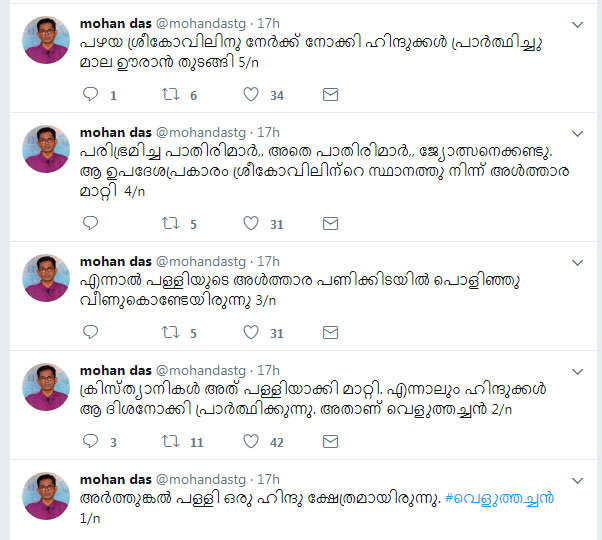 അര്‍ത്തുങ്കല്‍ പള്ളിക്കെതിരെ ബാബറി മസ്ജിദ് മോഡല്‍ ആഹ്വാനവുമായി ടി.ജി.മോഹന്‍ദാസ്; പള്ളി ശിവക്ഷേത്രമായിരുന്നെന്ന് ട്വീറ്റ്