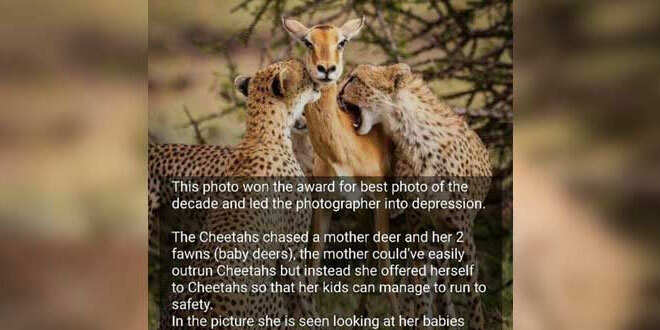തന്റെ കുട്ടികളെ ചീറ്റകളുടെ പിടിയില്‍ നിന്ന് രക്ഷിക്കാനായി ചീറ്റകള്‍ക്ക് പിടികൊടുത്ത മാനിന്റെ ചിത്രം എന്ന അടിക്കുറിപ്പോടെയാണ് ചിത്രം പ്രചരിച്ചത്. കുഞ്ഞുങ്ങള്‍ ഓടി രക്ഷപ്പെടുന്നത് ആശ്വാസത്തോടെ മാന്‍ നോക്കി നില്‍ക്കുകയാണെന്നും അടിക്കുറിപ്പ് പറയുന്നു. മാതൃത്വത്തിന്റെ മഹത്വവും ത്യാഗവും വിശദമാക്കുന്ന അടിക്കുറിപ്പില്‍ ഈ ചിത്രമെടുത്ത ഫോട്ടോഗ്രാഫര്‍ ഇതിനു ശേഷം വിഷാദരോഗിയായി മാറിയെന്നും പറയുന്നുണ്ട്. ലോകത്തെമ്പാടുമുള്ള സോഷ്യല്‍ മീഡിയ ഉപയോക്താക്കള്‍ ഈ ചിത്രം ഷെയര്‍ ചെയ്തു.