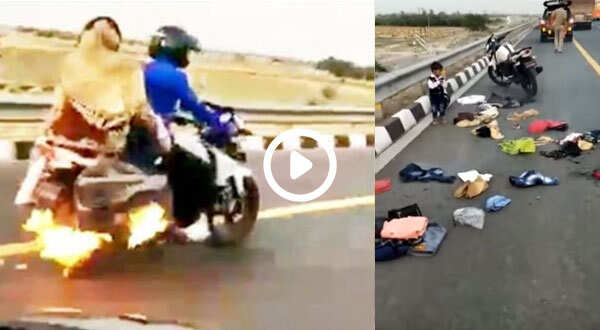 ഉടന് തന്നെ വാഹനം നിര്ത്തി തീ അണയ്ക്കുകയും ചെയ്തു. തീ പിടിച്ച ബാഗിലുണ്ടായിരുന്ന വസ്തുക്കള് മുഴുവനായും കത്തി നശിച്ചു. ബൈക്കില് ദമ്പതികളുടെ 3 മൂന്ന് വയസുള്ള കുട്ടിയുമുണ്ടായിരുന്നു. പോലീസുകാര് തന്നെയാണ് അപകടത്തിന്റെ ദൃശ്യങ്ങള് സമൂഹമാധ്യങ്ങളില് പോസ്റ്റ് ചെയ്തിരിക്കുന്നത്. ഇത് പിന്നീട് വൈറലാവുകയും ചെയ്തു.