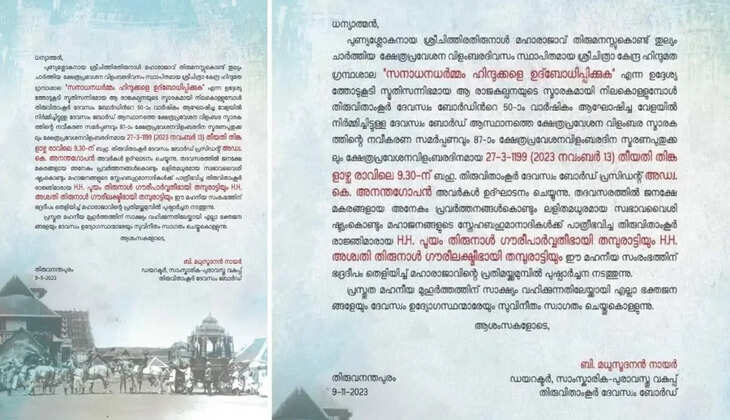 "ധന്യാത്മൻ,പുണ്യശ്ലോകനായ ശ്രീചിത്തിരതിരുനാൾ മഹാരാജാവ് തിരുമനസ്സുകൊണ്ട് തുല്യം ചാർത്തിയ ക്ഷേത്രപ്രവേശന വിളംബരദിവസം സ്ഥാപിതമായ ശ്രീ ചിത്രാ കേന്ദ്ര ഹിന്ദുമത ഗ്രന്ഥശാല 'സനാധനധർമ്മം ഹിന്ദുക്കളെ ഉദ്ബോധിപ്പിക്കുക' എന്ന ഉദ്ദേശ്യത്തോടുകൂടി സ്മൃതി സന്നിഭമായ ആ രാജകൽപനയുടെ സ്മാരകമായി നിലകൊള്ളുമ്പോൾ തിരുവിതാംകൂർ ദേവസ്വം ബോർഡിന്റെ 50-ാം വാർഷികം ആഘോഷിച്ച വേളയിൽ നിർമിച്ചിട്ടുള്ള ദേവസ്വം ബോർഡ് ആസ്ഥാനത്തെ ക്ഷേത്രപ്രവേശന വിളംബര സ്മാരകത്തിന്റെ നവീകരണ സമർപ്പണവും 87-ാം ക്ഷേത്രപ്രവേശന വിളംബരദിന സ്മരണ പുതുക്കലും ക്ഷേത്രപ്രവേശന വിളംബരദിനമായ 27-3-1199(2023 നവംബർ 13) തീയതി തിങ്കളാഴ്ച രാവിലെ 9.30ന് ബഹു. തിരുവിതാംകൂർ ദേവസ്വം ബോർഡ് പ്രസിഡന്റ് അഡ്വ.കെ.അനന്തഗോപൻ അവർകൾ ഉദ്ഘാടനം ചെയ്യുന്നു. തദവസരത്തിൽ ജനക്ഷേമകരങ്ങളായ അനേകം പ്രവർത്തനങ്ങൾകൊണ്ടും ലളിതമധുരമായ സ്വഭാവവൈശിഷ്ട്യം കൊണ്ടും മഹാജനങ്ങളുടെ സ്നേഹബഹുമാനാദികൾക്ക് പാത്രീഭവിച്ച തിരുവിതാംകൂർ രാജ്ഞിമാരായ എച്ച്.എച്ച്.പൂയം തിരുനാൾ ഗൗരീപാർവ്വതിഭായി തമ്പുരാട്ടിയും എച്ച്.എച്ച്.അശ്വതി തിരുനാൾ ഗൗരീലക്ഷ്മീഭായി തമ്പുരാട്ടിയും ഈ മഹനീയ സംരംഭത്തിന് ഭദ്രദീപം തെളിയിച്ച് മഹാരാജാവിന്റെ പ്രതിമയ്ക്ക മുമ്പിൽ പുഷ്പാർച്ചന നടത്തുന്നു. പ്രസ്തുത മഹനീയ മുഹൂർത്തത്തിന് സാക്ഷ്യം വഹിക്കുന്നതിലേയ്ക്കായി എല്ലാ ഭക്തജനങ്ങളെയും ദേവസ്വം ഉദ്യോഗസ്ഥരെയും സുവിനീതം സ്വാഗതം ചെയ്തുകൊള്ളുന്നു. ആശംസകളോടെ, ഡയറക്ടർ, സാംസ്കാരിക- പുരാവസ്തു വകുപ്പ് തിരുവിതാംകൂർ ദേവസ്വം ബോർഡ്.